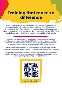 A Marketing Asset created by working closely with the communications team. This was designed to be taken to the Royal Highland Show and any future events. It is a flyer to advertise the e-learning training courses I have been rebranding for the charity. I created several new assets and reworked some from the existing branding. I created the front asset as a way to demonstrate mental health in a neutral way, as something everyone has.